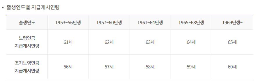 1953년부터 1956년생은 61세, 1957년부터 1960년생은 62세, 1961년부터 1964년생은 63세, 1965년부터 1968년생은 64세, 그리고 1969년 이후 출생자는 65세부터 노령연금을 수령할 수 있습니다.