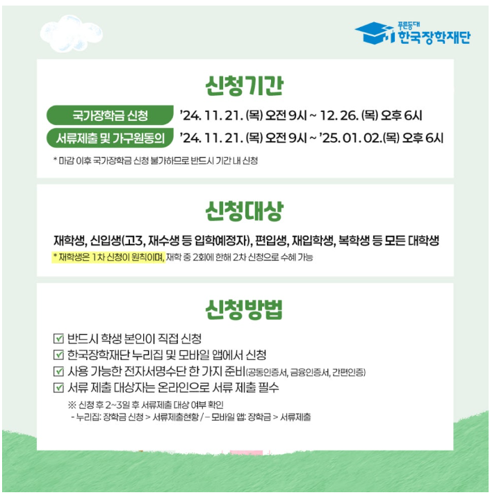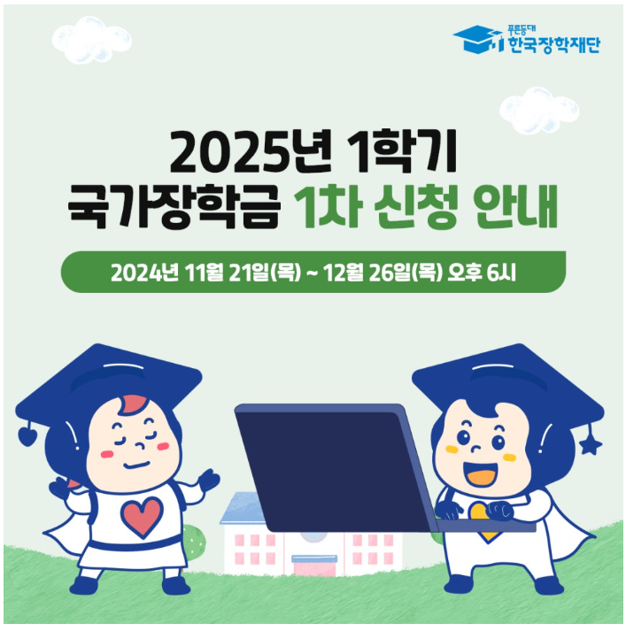 좋은 소식이 있어요! 2025년 국가 장학금 신청기간에 신청하면 더 많은 학생들이 혜택을 받을 수 있어요.