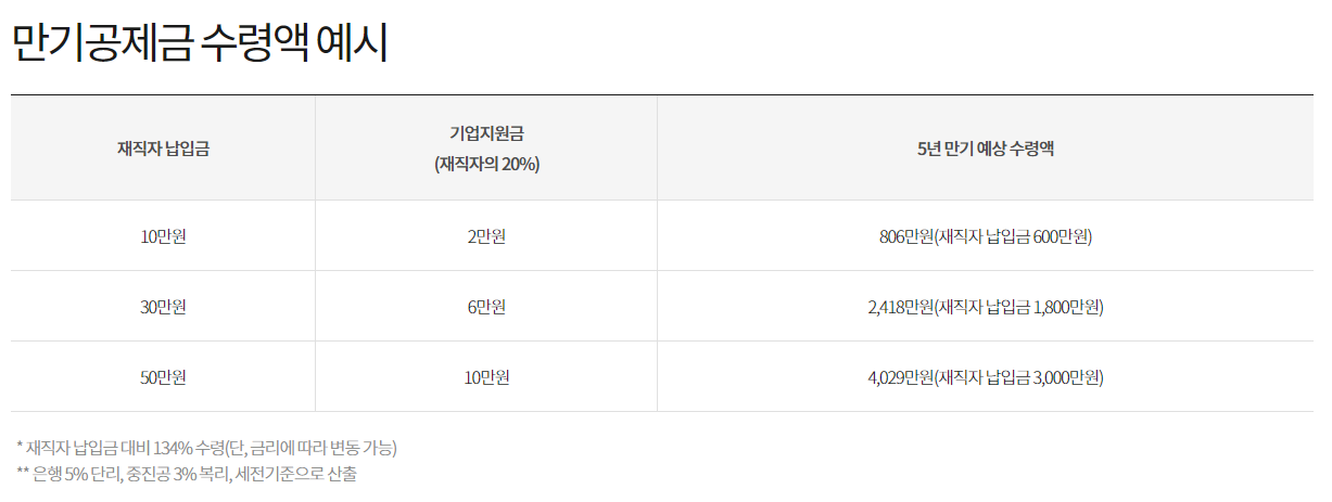 - 기업 지원금: 기업은 재직자의 납입금의 20%를 추가 지원합니다. 예를 들어, 월 50만 원을 적립하면 기업은 추가로 10만 원을 지원합니다.