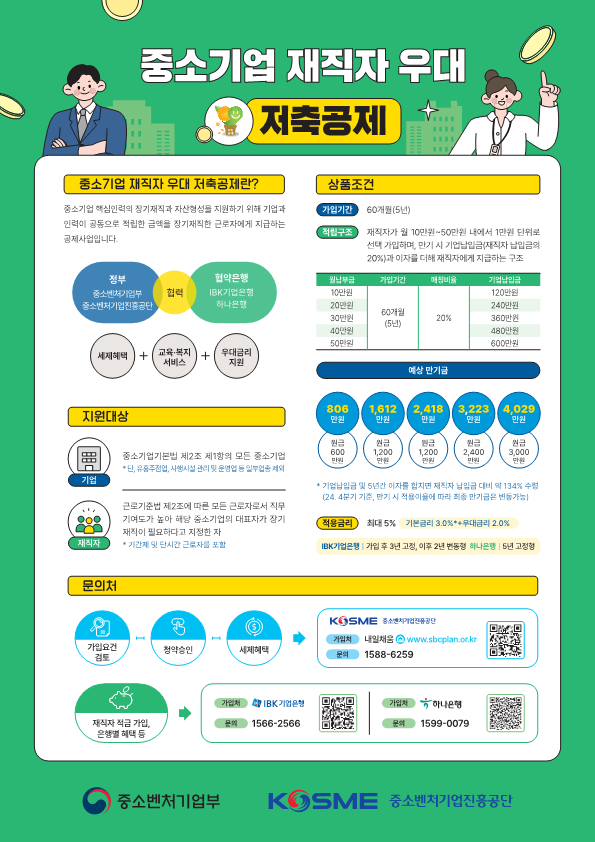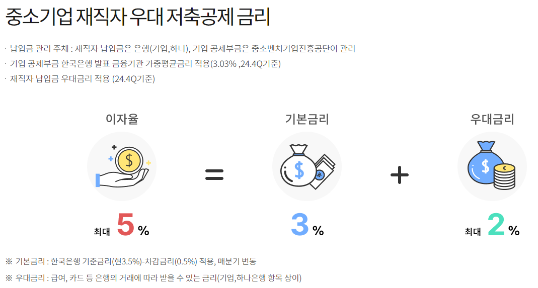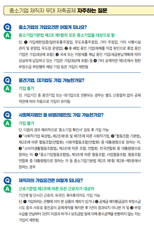 - 가입 대상: 중소기업에 재직 중인 모든 직원이 자격 대상입니다. 중견기업이나 대기업 재직자는 이 혜택을 받을 수 없습니다.