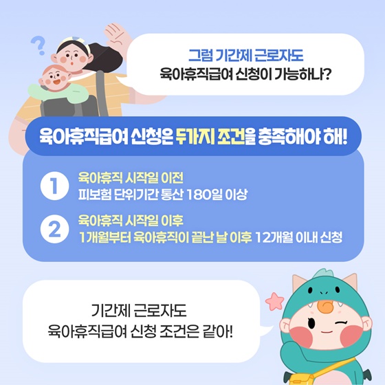 육아휴직을 시작하는 날 기준으로 고용보험에 가입된 기간이 180일 이상이어야 합니다.