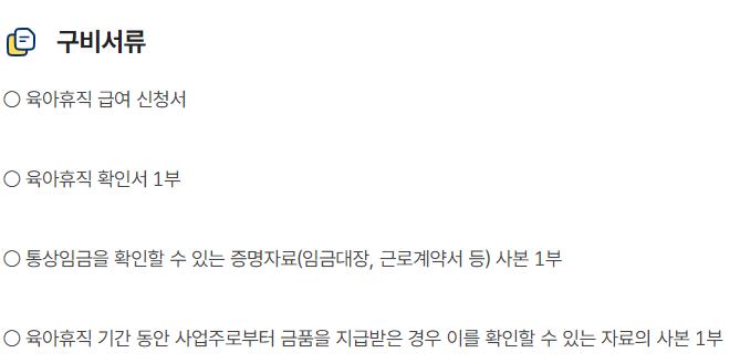 주요 서류로는 육아휴직급여신청서, 육아휴직확인서, 통상임금을 확인할 수 있는 증명자료 등이 있습니다.