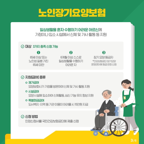 65세 이상 노인 중 노인성 질환으로 일상생활이 어려운 분들을 위한 장기요양제도도 있습니다.