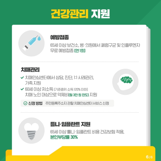 코로나19, 독감, 폐렴구균, 대상포진 등의 예방접종을 무료로 받을 수 있어 건강한 노후 생활에 큰 도움이 됩니다.