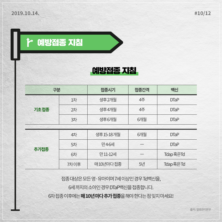 - 성인 추가 접종: 10년마다 1회