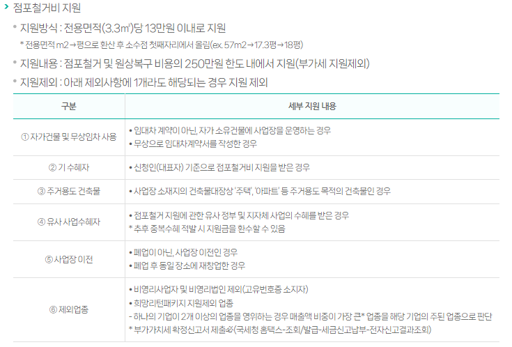 구체적인 금액을 살펴보면, 점포 정리 비용으로 최대 250만원까지 지원받을 수 있습니다.