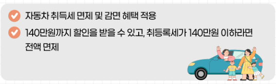 - 140만원까지 할인을 받을 수 있고, 취등록세가 140만원 이하라면 전액 면제